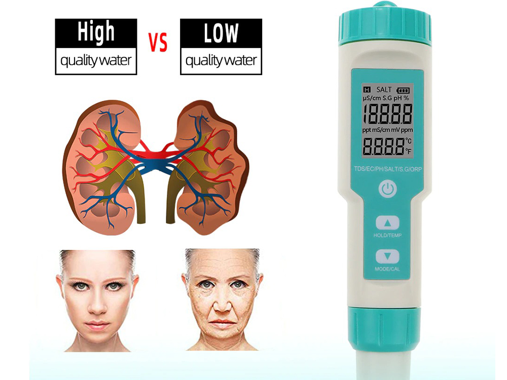 Ви зможете виміряти PH, TDS, EC, ORP, питома вага морської води, а також температуру.