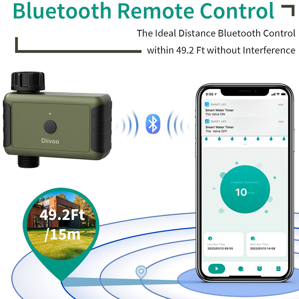 Додайте таймер розбризкування в Smart Life через Bluetooth, з'єднання Bluetooth дозволяє телефону отримувати повідомлення про робочий стан, коли ви знаходитесь в межах діапазону дійсного з'єднання Bluetooth (Примітка: максимальний діапазон роботи Bluetooth становить 15 метрів без перешкод) Автоматичний таймер поливу Diivoo можна