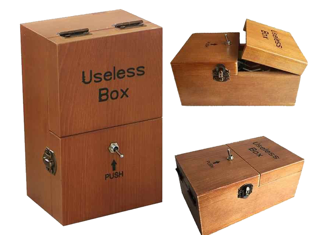Не корисна коробка Useles Box з натурального дерева - це сама марна коробка, яка тільки може бути. Але все ж, її хочуть мати майже все! Це коробка, щоб просто сходити з розуму до нескінченності. Варто тільки натиснути важіль для відкриття коробки, як звідти з'являється пластиковий язичок, який її закриє. Відгук дуже швидкий і без затримки.