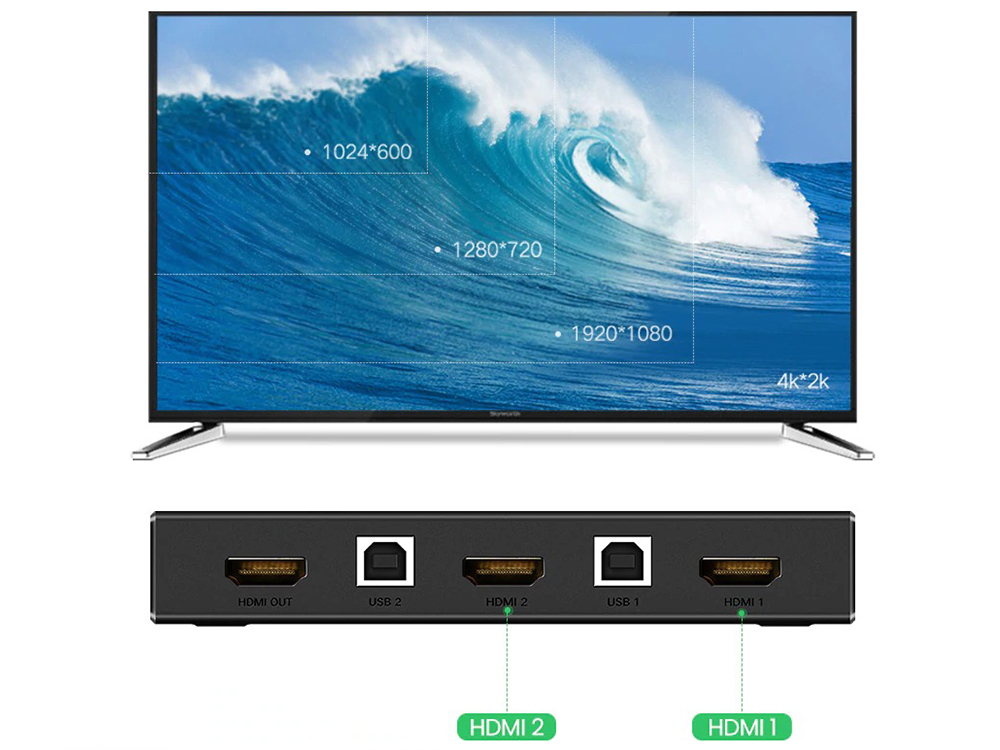Показати оптові ціниКомутатор Ugreen 2 в 1 Out KVM HDMI x 4K-30Hz 1,5 - завдяки цьому комутатора Ви зможете управляти відразу 2-ма ПК або геймерським приставками і ТБ-боксами, через екран ТВ, ПК за допомогою мишки або клавіатури.