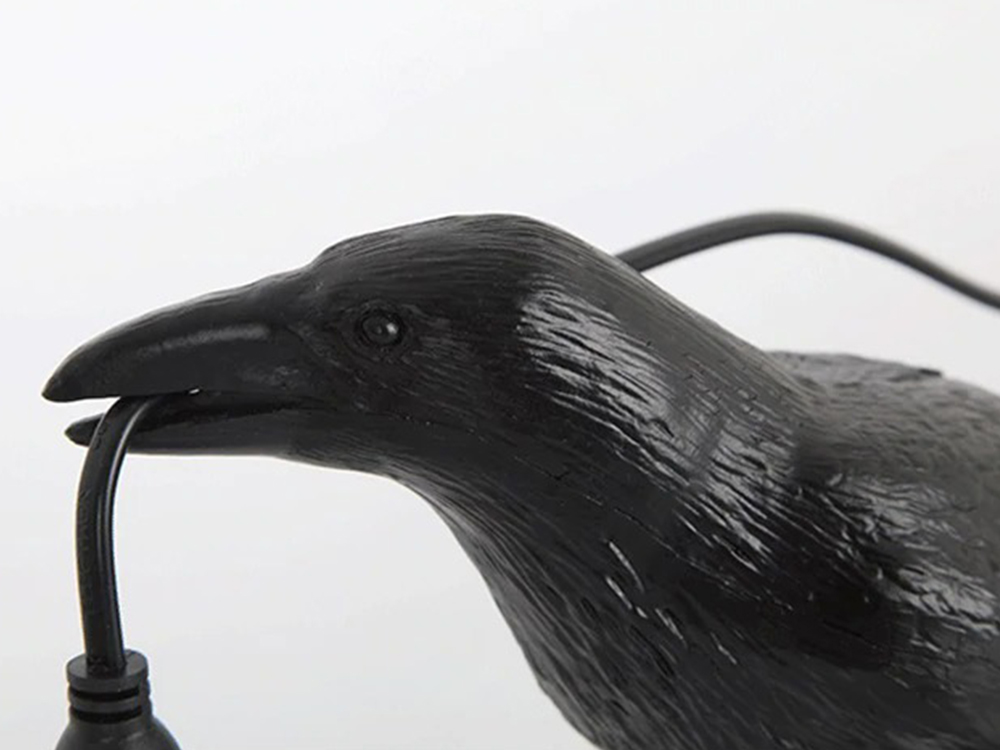 Лампа виконана дуже деталізовано. Дзьоб крила хвіст, очі все просто ідентично. У дзьобі ворона тримає провід, на якому бовтається лампочка.