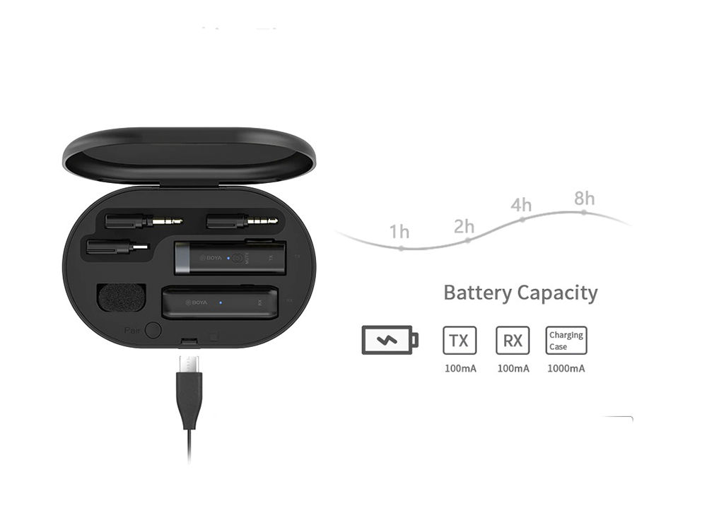 Живлення зарядного футляра від акумулятора 1000 мАг. Час роботи приймача та передавача TX-4.5 години, RX-8 годин. Час зарядки TX-2 години, RX-2 години. Зарядний кабель Type C-USB йде в комплекті, 30 см.