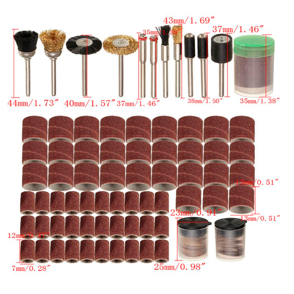 У комплект входять фрези, щітки по металу, полірувальні та шліфувальні насадки, різної зернистості конуси з наждакового паперу тощо.
